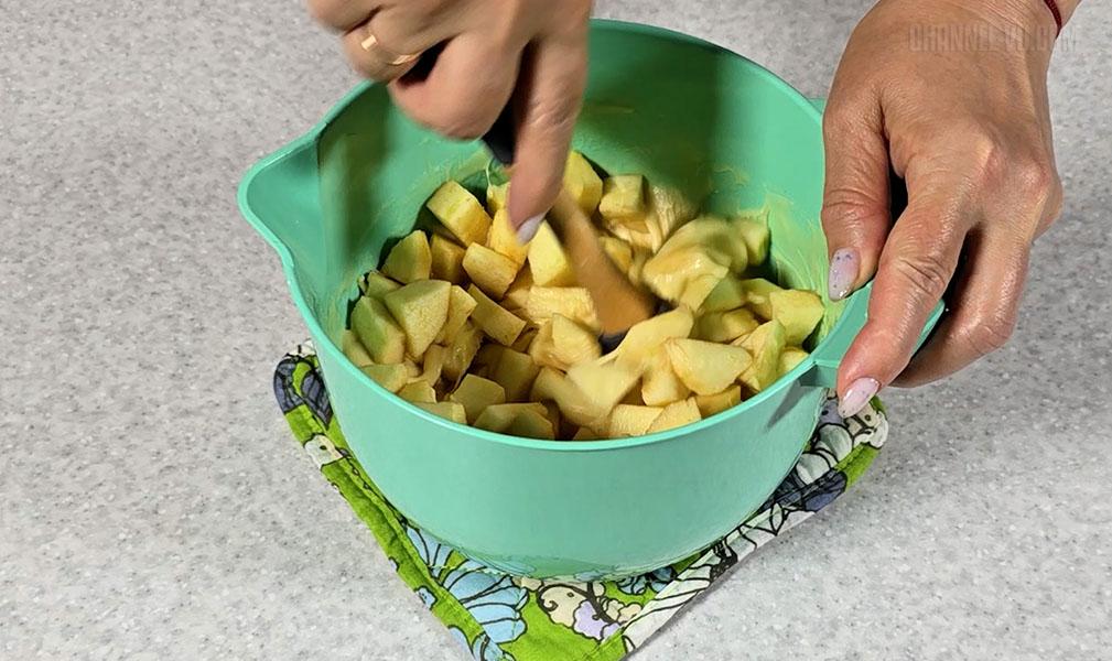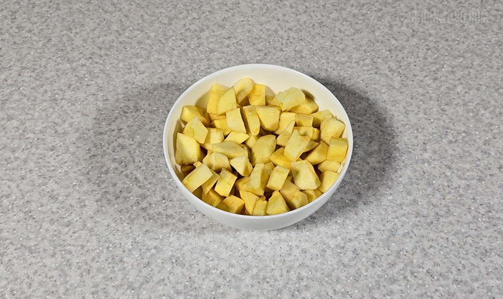 1. Яблука помити, очистити від шкірок та насіння і нарізати на шматочки. Можна до них додати трохи лимонного соку та перемішати їх.