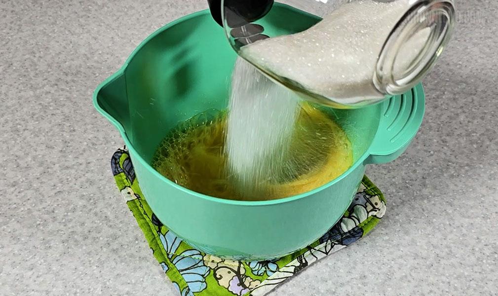 3. В масу частинами додати цукор та ванільний цукор. Збити до білої пишної маси.