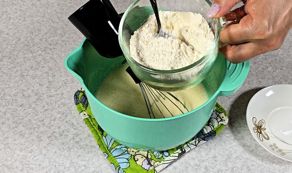 4. Після цього додати просіяне борошно з розпушувачем та все добре перемішати.
