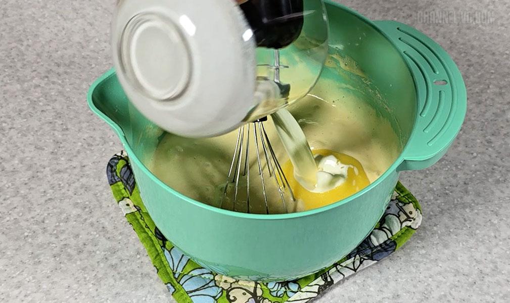 5. Влити в тісто розтоплене, не гаряче вершкове масло та вершки (можна сметану), та ще раз гарно перемішати.