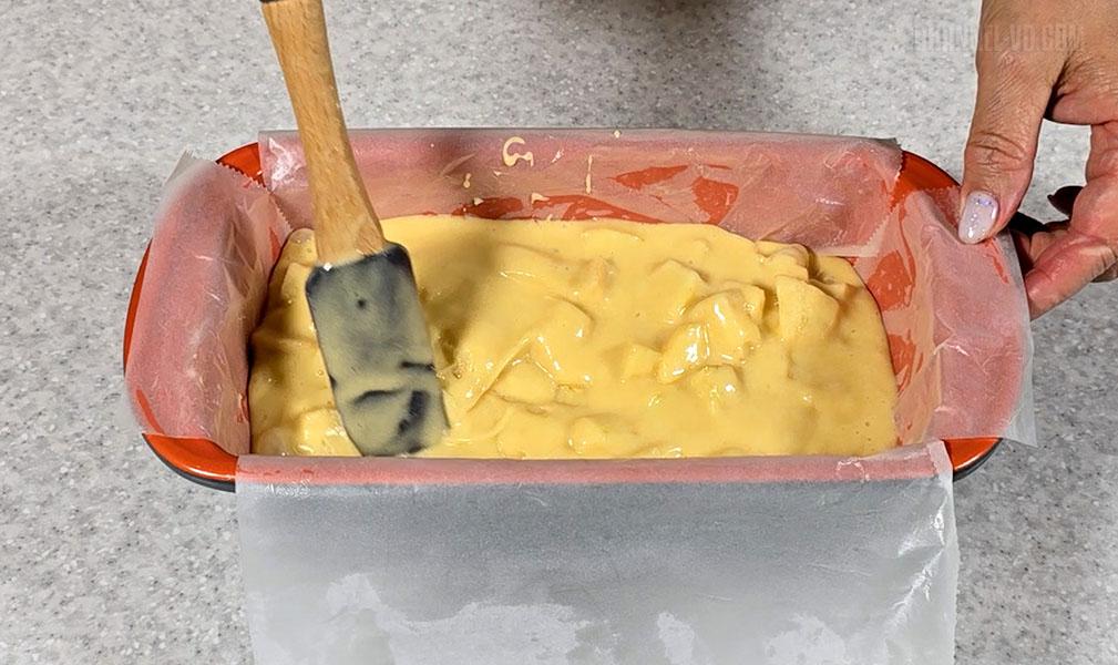7. Форму та пергамент змастити вершковим маслом. Викласти тісто з яблуками в форму.