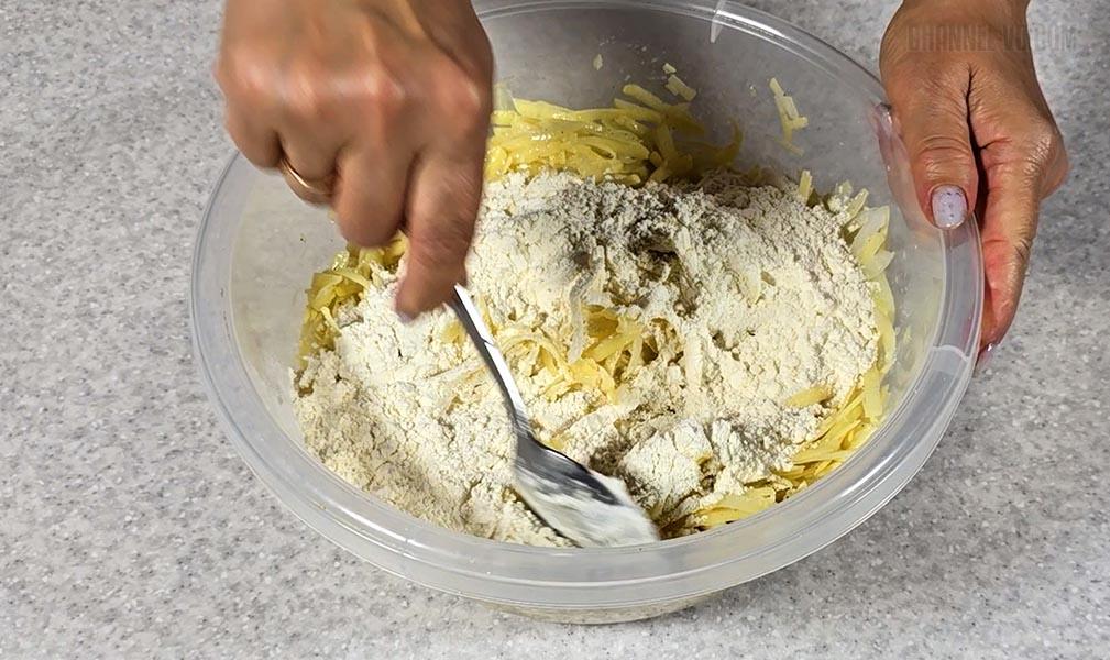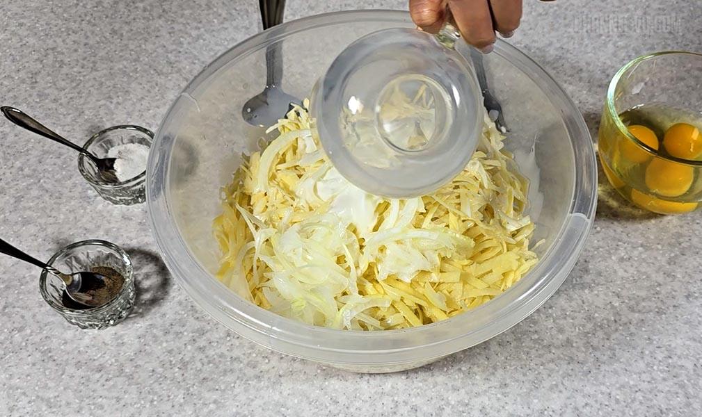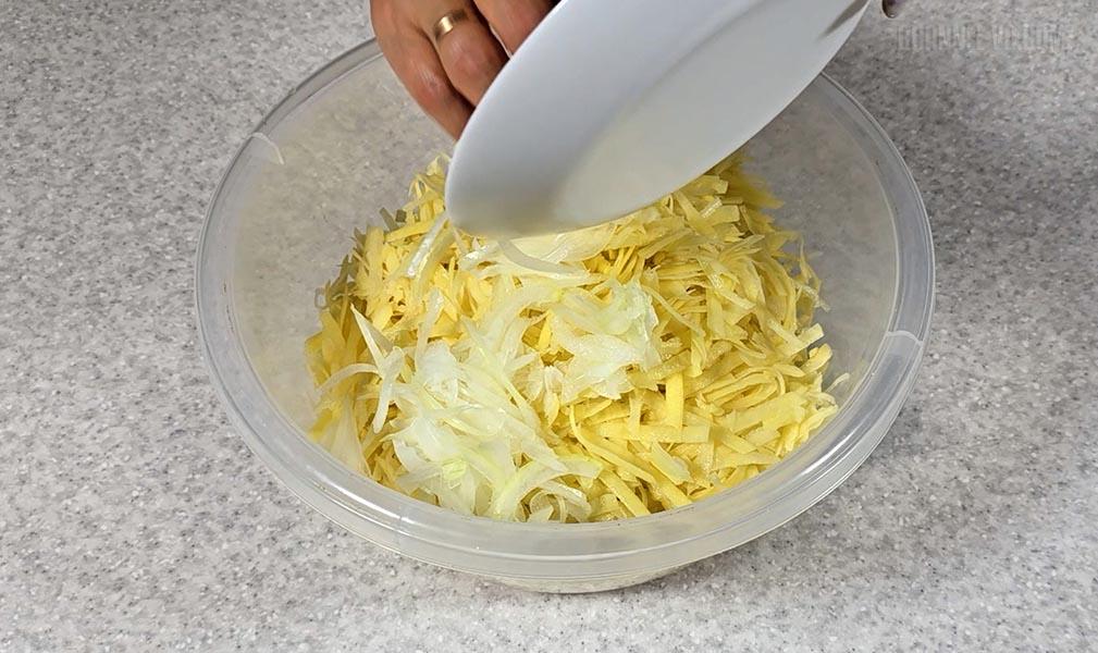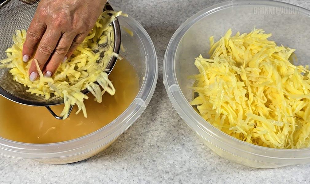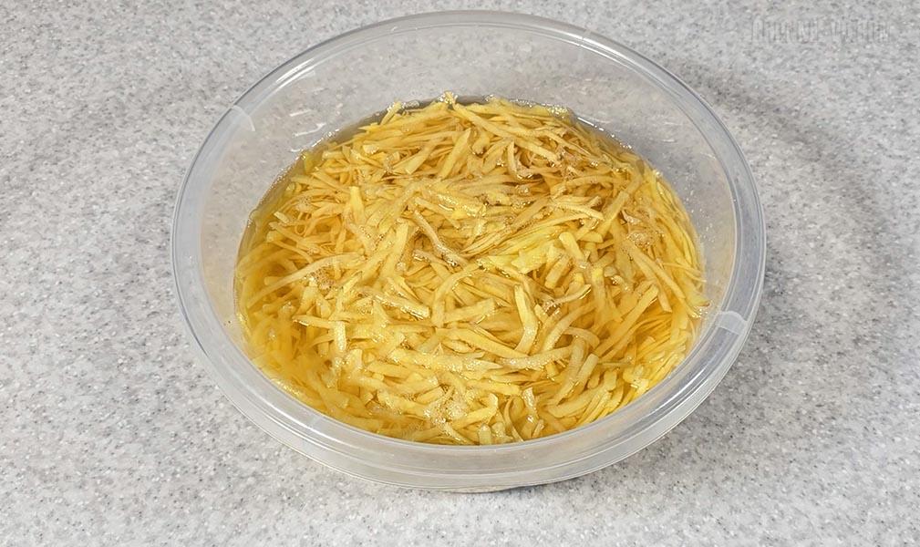 1. Заздалегідь картоплю натерти на крупній терці, залити холодною водою і так залишити на 20 хвилин.