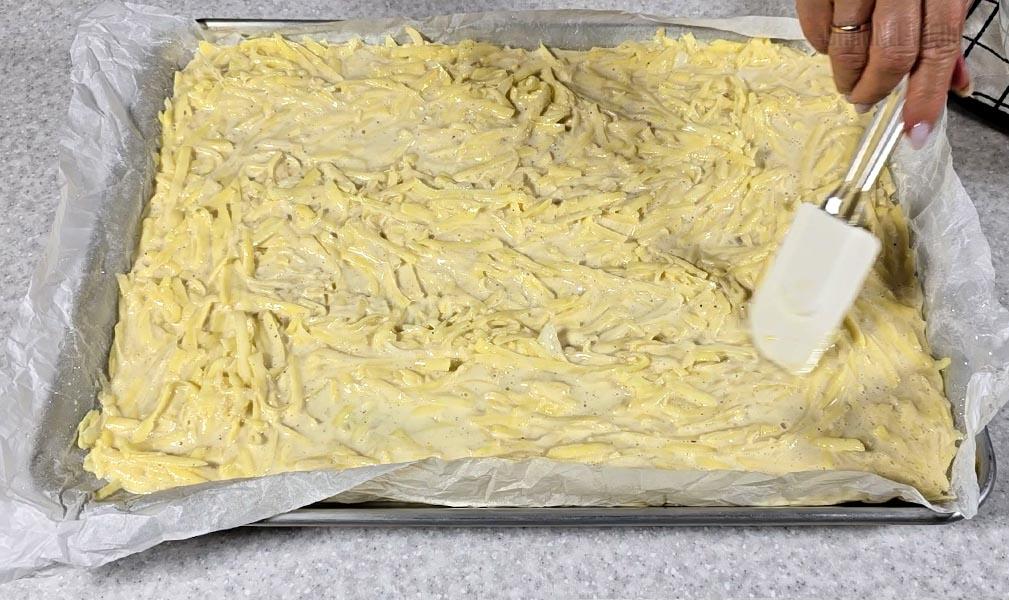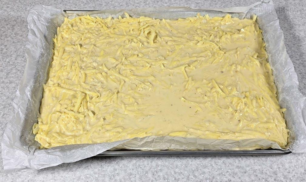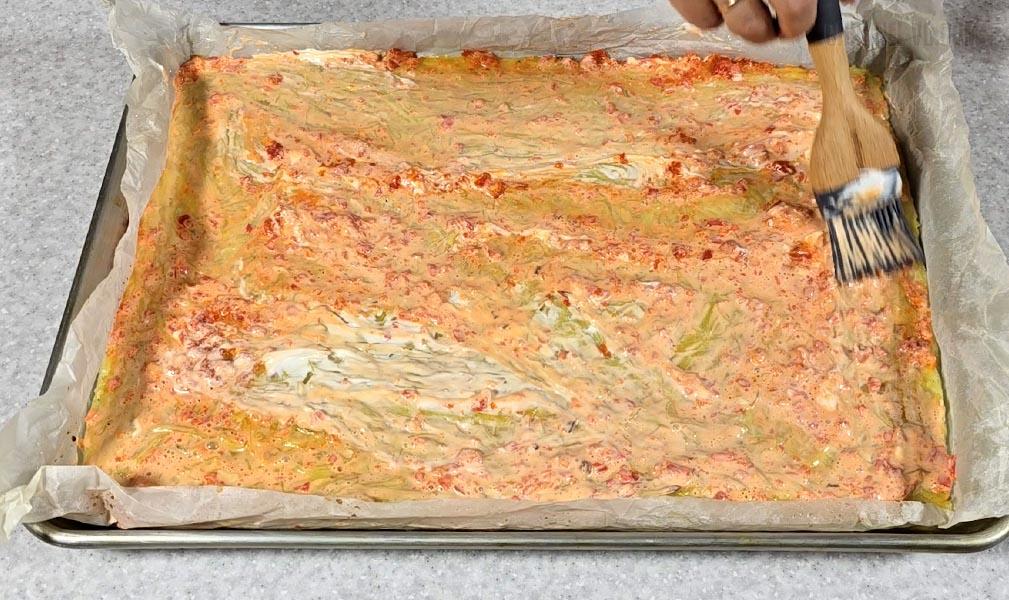 7. Відправити деко з масою в розігріту до 180 °С духовку. Готувати основу 30-35 хвилин до легкої рум'яності.