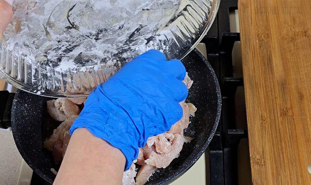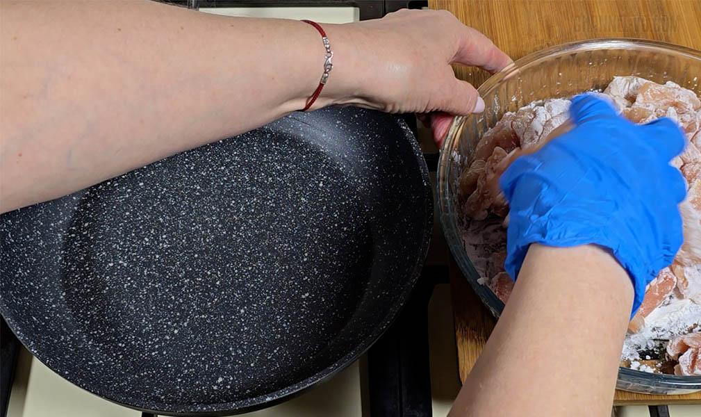 1. Куряче м'ясо нарізати смужками, посипати крохмалем та усе перемішати.