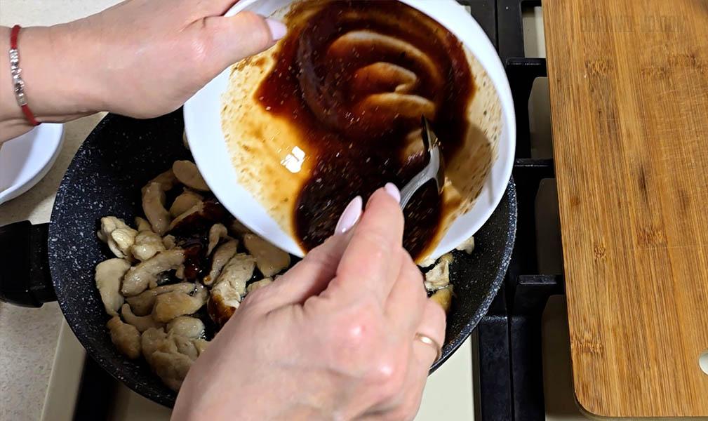 3. Змішати: спеції, кетчуп, соус «Унагі» та соєвий соус. Додати до курки разом із подрібненим часником.