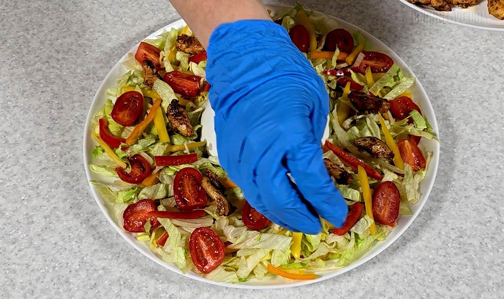 6. Викласти овочі на тарілку для подачі. Далі за ними – охолоджене куряче м'ясо.
