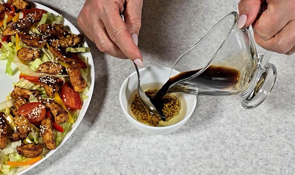 8. Для заправки салату змішати: гірчицю в зернах, олію та соєвий соус.