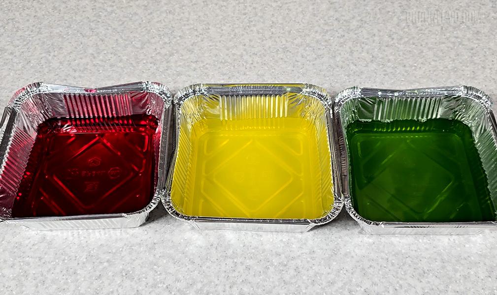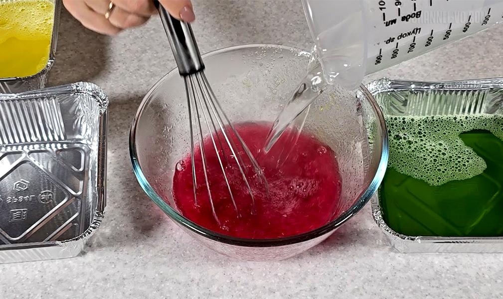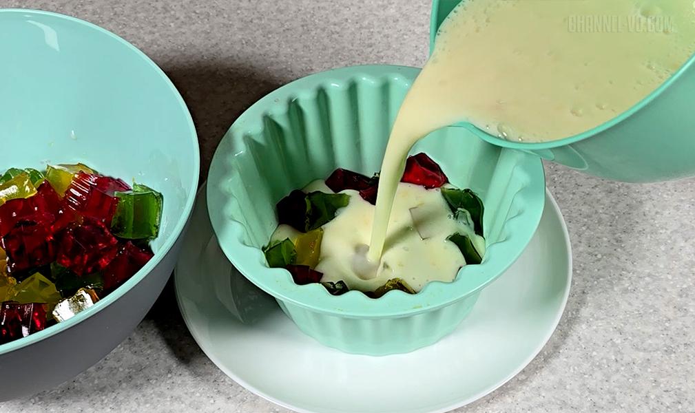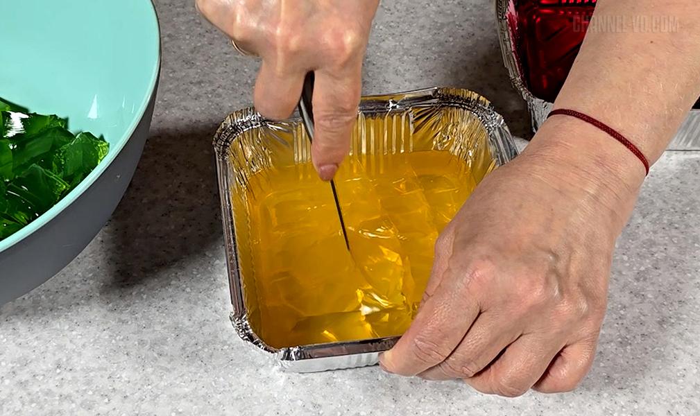 1. Вміст кожного пакетика желе різних смаків розчинити у 250 мл гарячої води. Води має бути менше ніж зазвичай зазначено в інструкції на упаковці, щоб желе було щільнішим.