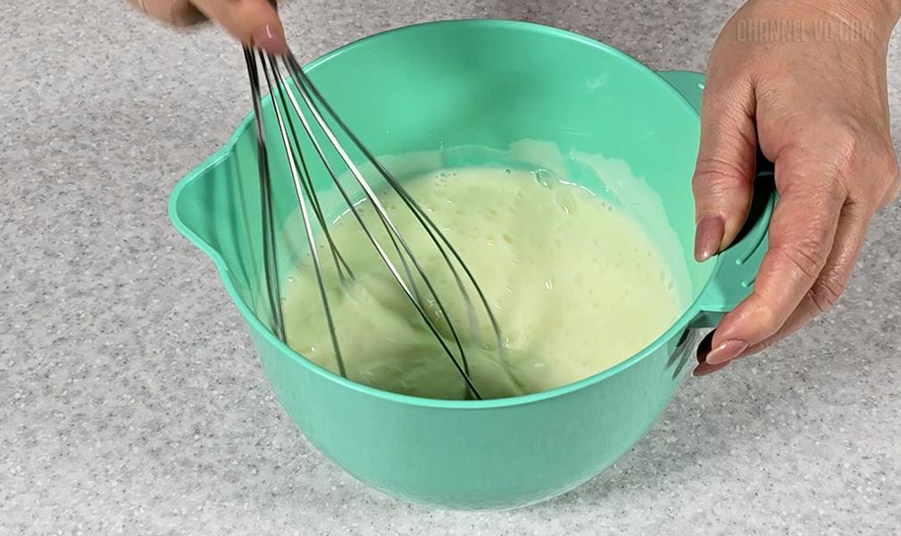 6. Влити розтоплений желатин до йогуртової маси, постійно помішуючи, щоб він рівномірно розподілився.