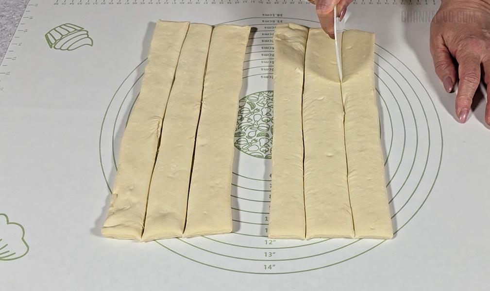 1. Листкове дріжджове тісто розморозити та нарізати на смужки шириною 2-3 см.