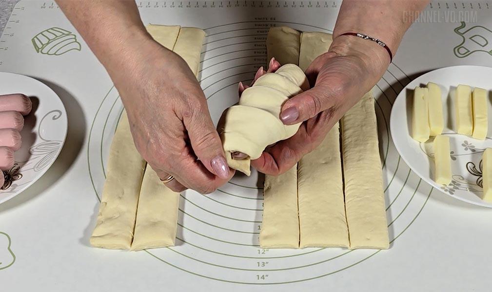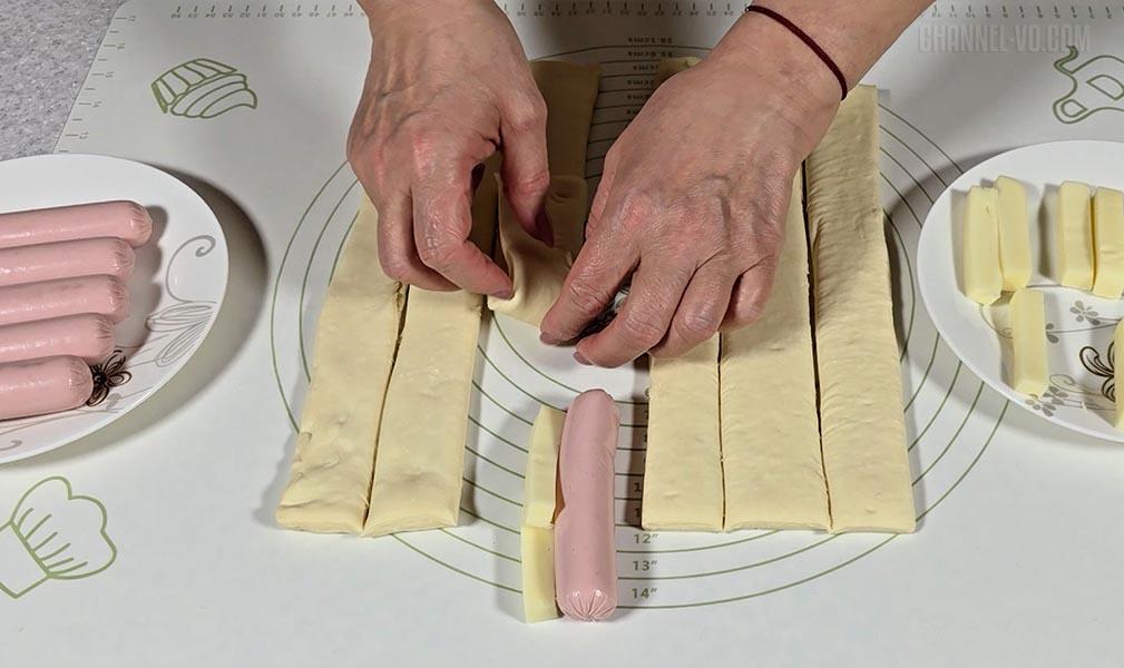3. «Сулугуні» та сосиски обмотати смужками тіста, щільно притискаючи, щоб сир не витікав під час приготування.