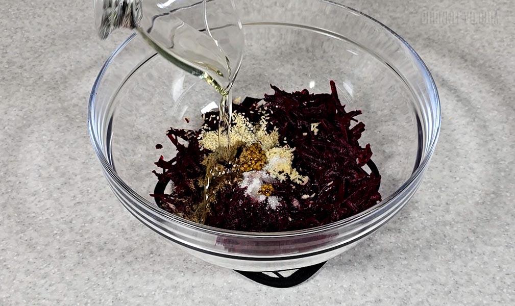 3. Далі додати: кунжут, сіль, цукор, мелений перець, мелений коріандр, гірчицю в зернах, яблучний оцет та олію. Все гарно перемішати.