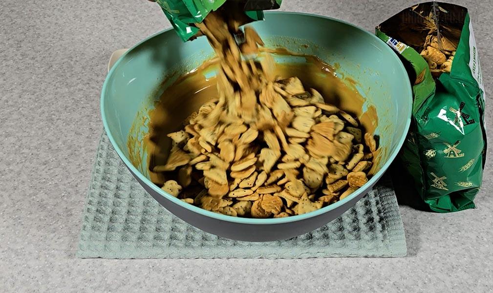 5. Змішати печиво з кремом. Я буду використовувати для торту – крекер з маком. Якщо ви візьмете пісочне печиво, то його потрібно руками подрібнити на невеликі шматочки.