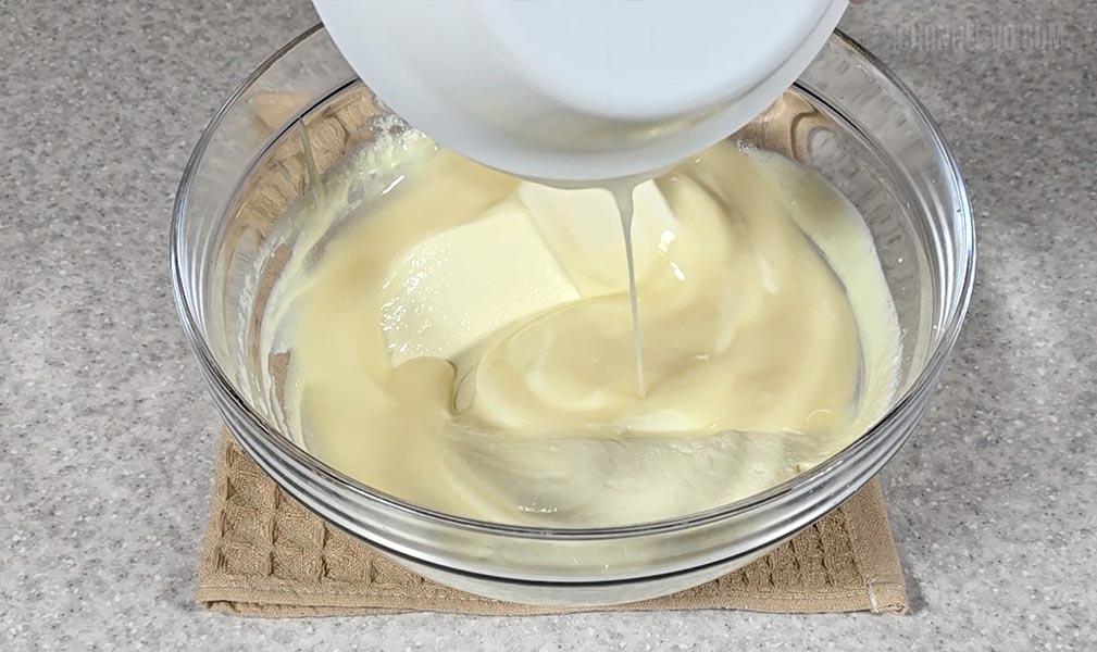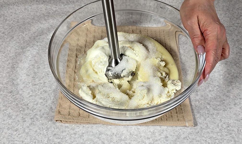 3. До сиру додати: сметану, згущене молоко, цукор, ванільний цукор. Збити масу блендером.