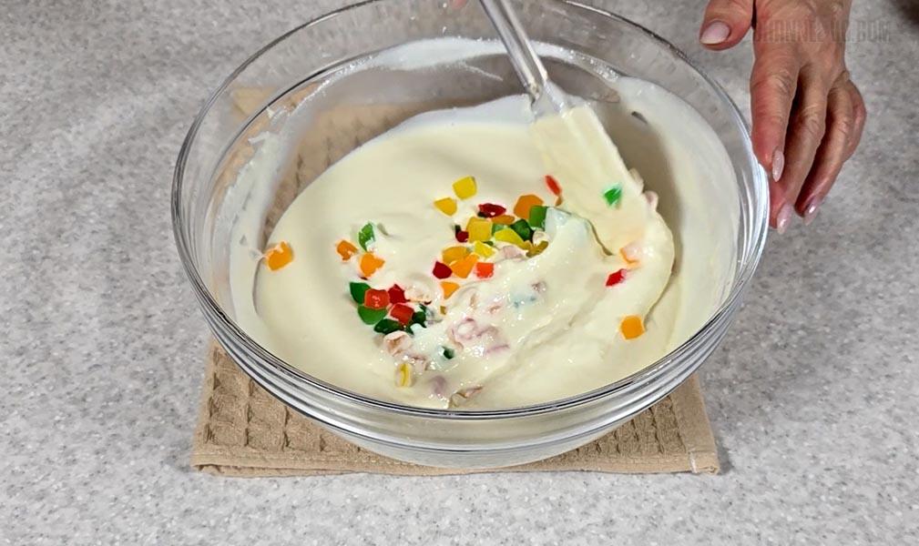6. Цукати промити гарячою водою та додати у сирну масу. Все перемішати.