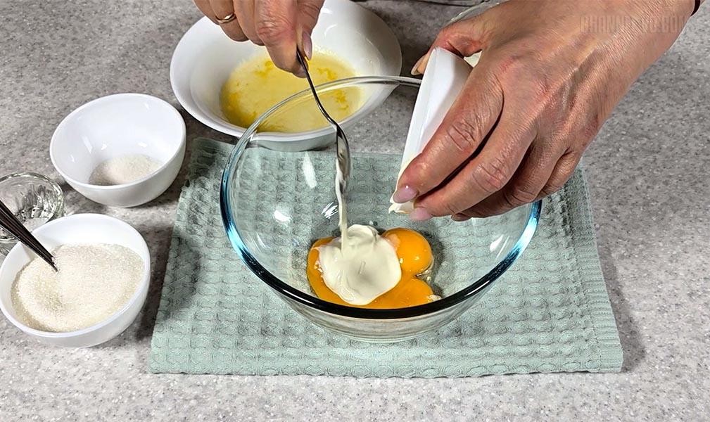1. Змішати вінчиком: яєчні жовтки, сметану кімнатної температури, цукор, ванільний цукор, сіль, тепле молоко та розтоплене вершкове масло.