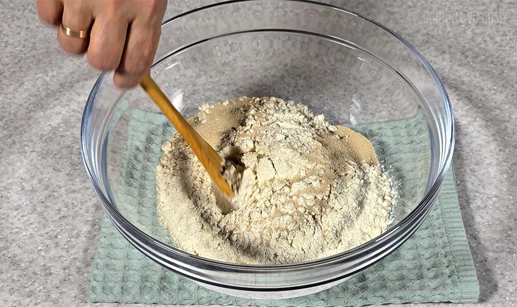 2. В просіяне борошно всипати дріжджі та все перемішати.