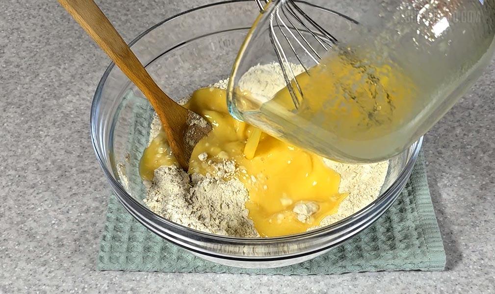 3. Далі до борошна додати рідку масу. Замішати тісто.