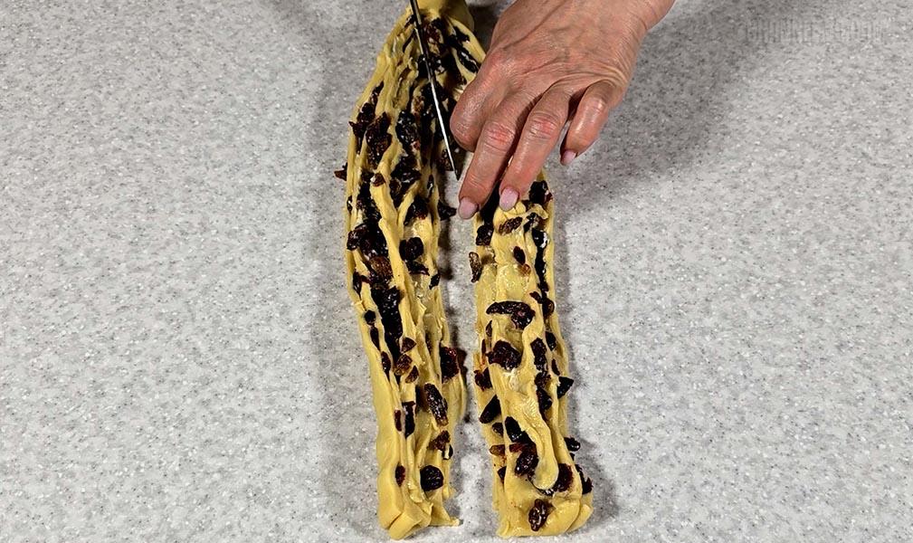 11. Рулет розрізати гострим ножем уздовж, навпіл, не доходячи до краю 2-3 см.