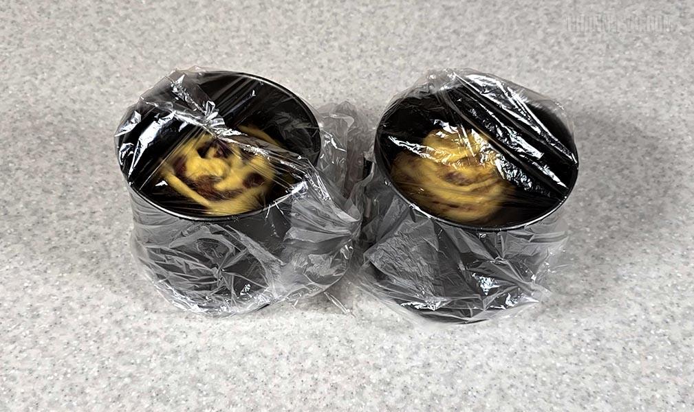 18. Далі поставити форми з тістом у холодну духовку. Увімкнути на температуру 175 °С (режим «верх – низ», без конвекції). Випікати 15-20 хвилин – до рум'яності. Потім накрити фольгою їх і випікати ще 20-25 хвилин – до сухої дерев'яної шпажки.